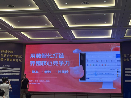2023年9月12日共生食造软件研发部经理杨松代表铁骑力士进行会议报告,以“用数智化打造养殖核心竞争力”为主题对铁骑力士在生猪数智化养殖取得的成效进行汇报,分享了企业从传统养殖到数智化养殖的转变,以及对“降本、增效、控风险”的数智化建设思路,通过汇报获得了行业专家及教授对铁骑力士生猪数智化建设的高度认可。