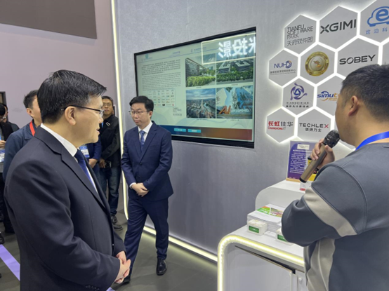 四川省副省长左永祥、成都市商务局副局长李晓勇一行到四川数字贸易洽谈馆参观。共生食造硬件工程师郭雄向副省长左永祥介绍了铁骑力士的成长历程及此次参展带来的自主研发产品。
